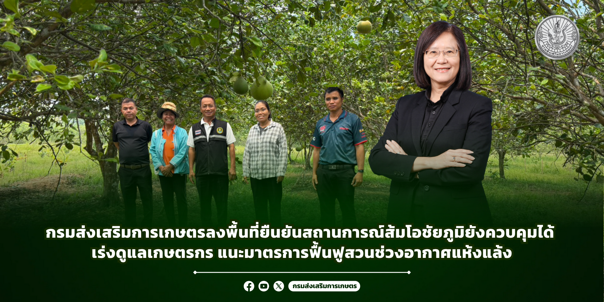 จากกรณีที่มีการเผยแพร่ข้อมูลผ่านสื่อออนไลน์เกี่ยวกับสถานการณ์สวนส้มโอในพื้นที่ตำบลโนนทอง อำเภอเกษตรสมบูรณ์ จังหวัดชัยภูมิ ว่าได้รับผลกระทบจากสภาพอากาศแห้งแล้งจนยืนต้นตายเป็นวงกว้างนั้น กรมส่งเสริมการเกษตร ได้ลงพื้นที่ตรวจสอบข้อเท็จจริงแล้ว พบว่า ไม่ปรากฏกรณีส้มโอยืนต้นตายเป็นวงกว้างตามที่เป็นข่าว โดยสถานการณ์โดยรวมยังอยู่ในระดับที่สามารถบริหารจัดการได้