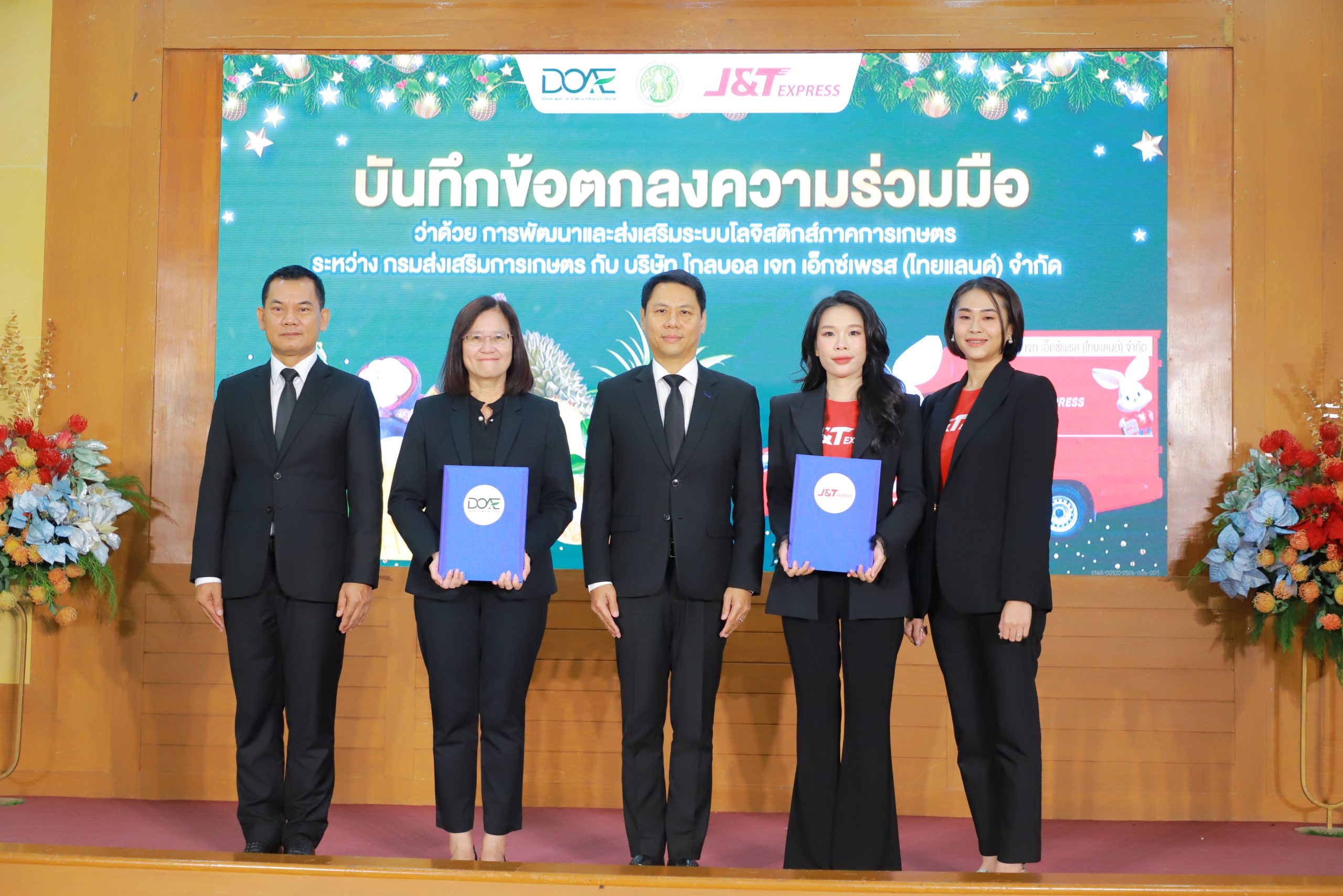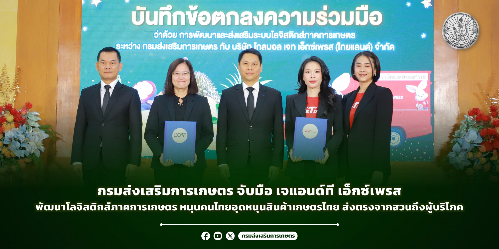 กรมส่งเสริมการเกษตร ลงนามบันทึกข้อตกลงความร่วมมือ (MOU) กับ บริษัท โกลบอล เจท เอ็กซ์เพรส (ไทยแลนด์) จำกัด หรือ J&T Express ประเทศไทย เพื่อร่วมกันพัฒนาและส่งเสริมระบบโลจิสติกส์ภาคการเกษตรอย่างครบวงจร ตั้งแต่กระบวนการผลิต การจัดการสินค้า บรรจุภัณฑ์ การบริหารสินค้าคงคลัง การตลาด ไปจนถึงการขนส่งและส่งมอบสินค้าเกษตรสู่มือผู้บริโภคอย่างมีประสิทธิภาพ พร้อมทั้งสนับสนุนให้คนไทยเข้าถึงสินค้าเกษตรคุณภาพจากเกษตรกรไทยโดยตรง โดยมีนายกฤษ อุตตมะเวทิน รองปลัดกระทรวงเกษตรและสหกรณ์ ร่วมเป็นสักขีพยานในการลงนามครั้งนี้  ณ กรมส่งเสริมการเกษตร