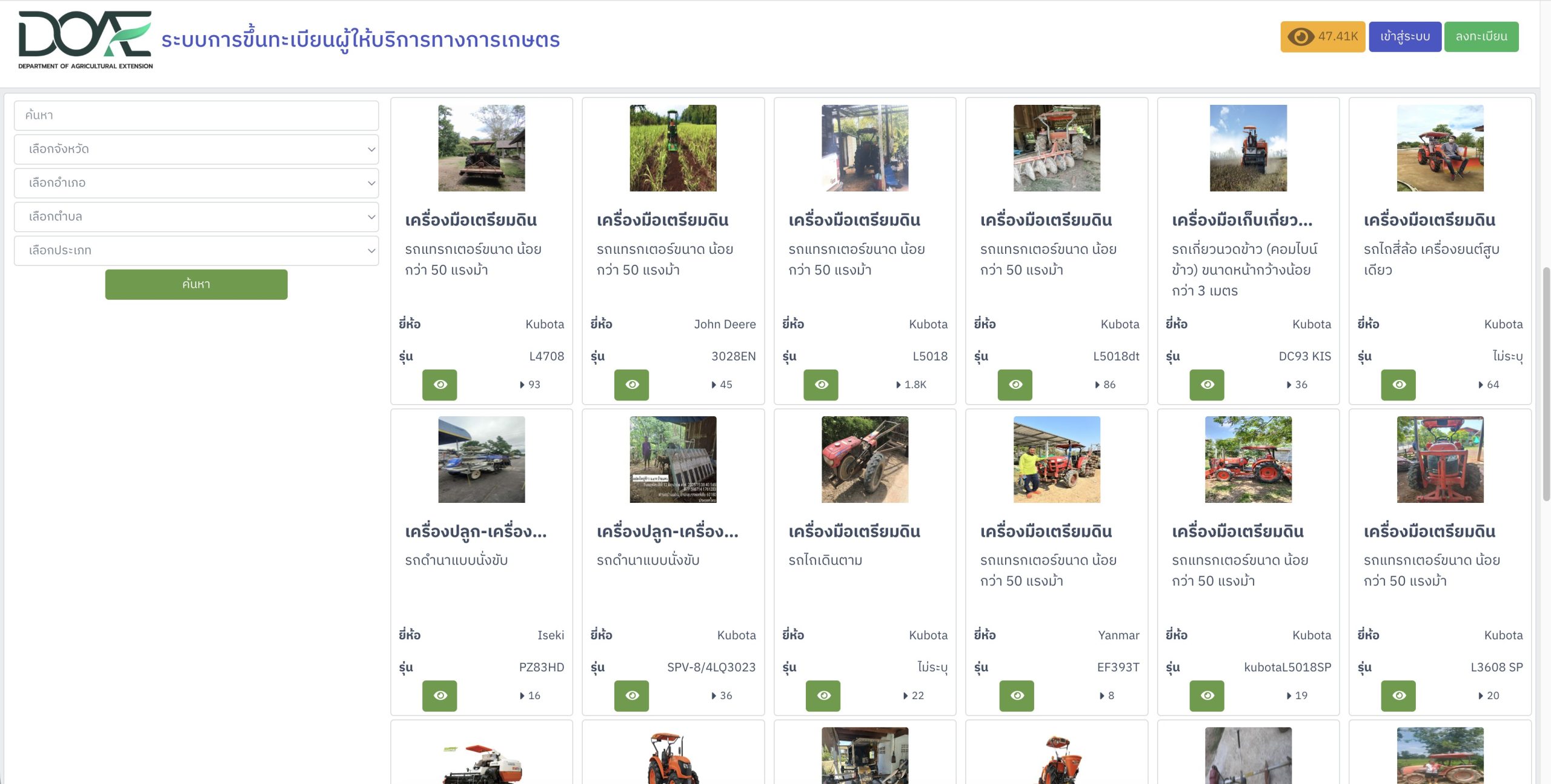 ข้อมูล ณ ปัจจุบัน มีผู้ขึ้นทะเบียนผู้ให้บริการทางการเกษตร ผ่านระบบฯ จำนวน 2,204 ราย และมีเครื่องจักรกลการเกษตรขึ้นทะเบียนกว่า 3,500 รายการ ครอบคลุมเครื่องมือเตรียมดิน 2,430 รายการ เครื่องปลูก–หยอด 160 รายการ เครื่องดูแลรักษา 450 รายการ เครื่องเก็บเกี่ยว 530 รายการ ระบบบริหารขนส่ง 350 รายการ และบริการอื่น ๆ อีก 70 รายการ