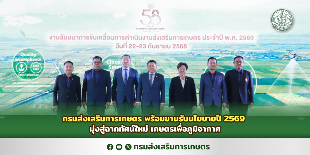 ของเกษตรกรและชุมชน พัฒนาภาพลักษณ์และจุดขายเฉพาะของสินค้าเกษตรและวิสาหกิจชุมชน ให้มีคุณค่าและเป็นที่จดจำ ออกแบบผลิตภัณฑ์ (Product Design) ยกระดับคุณภาพ บรรจุภัณฑ์ และมาตรฐานสินค้าให้ตรงกับความต้องการของผู้บริโภคยุคใหม่ ใช้ช่องทาง E-Commerce และตลาดสมัยใหม่ ขยายโอกาสทางการตลาดทั้งในและต่างประเทศ ผ่านแพลตฟอร์มออนไลน์และเครือข่ายค้าปลีกสมัยใหม่ - พัฒนาเจ้าหน้าที่ส่งเสริมการเกษตร อย่างน้อย 80% เป็น Climate Smart Extension Officers สามารถใช้เทคโนโลยีดิจิทัลและการจัดการข้อมูลเพื่อการตัดสินใจ “การขับเคลื่อนงานของกรมส่งเสริมการเกษตร จะไม่ใช่เพียงอวสานของการเกษตรแบบเดิม แต่คือ การก้าวเข้าสู่ฉากทัศน์ใหม่ ที่เกษตรกรไทยสามารถปรับตัว แข่งขัน และเติบโตได้อย่างยั่งยืน ยึดเป้าหมายเกษตรกร สู่การยกระดับรายได้และคุณภาพชีวิตเกษตรกร รวมถึงการเห็นผลลัพธ์ที่เป็นรูปธรรม โปร่งใส และตรวจสอบได้ เพื่อความเชื่อมั่นของเกษตรกรและสังคม” อธิบดีกรมส่งเสริมการเกษตรกล่าวทิ้งท้าย.-