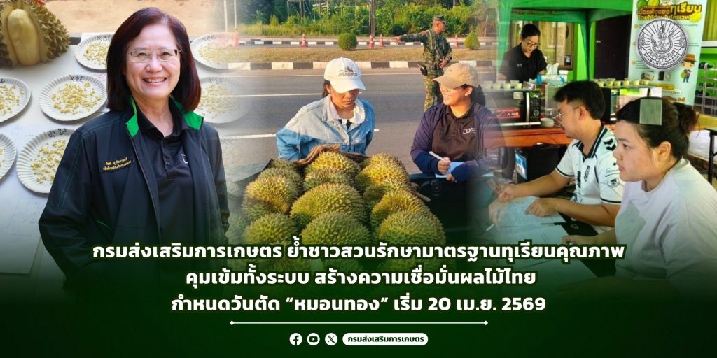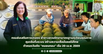 นางอัญชลี สุวจิตตานนท์ อธิบดีกรมส่งเสริมการเกษตร เปิดเผยว่า จังหวัดจันทบุรีมีผลผลิต 683,027 ตัน เพิ่มขึ้นร้อยละ 18.66 และจะออกสู่ตลาดสูงสุดในเดือนพฤษภาคม โดยย้ำให้เกษตรกรเป็นกลไกหลักในการรักษามาตรฐานคุณภาพ เพื่อสร้างความเชื่อมั่นแก่ผู้บริโภคทั้งในและต่างประเทศ กรมฯ กำหนดมาตรการควบคุมคุณภาพเข้มงวดตลอดห่วงโซ่ ภายใต้แนวทาง “ตรวจก่อนตัด จัดระเบียบสวน กระบวนการผลิตปลอดภัย” พร้อมกำหนดวันเริ่มตัดทุเรียนพันธุ์หมอนทองและก้านยาว ตั้งแต่วันที่ 20 เมษายน 2569 เพื่อป้องกันทุเรียนอ่อนและรักษามาตรฐานสินค้า โดยเกษตรกรต้องตรวจเปอร์เซ็นต์น้ำหนักเนื้อแห้งก่อนเก็บเกี่ยว โดยพันธุ์หมอนทองและก้านยาวต้องไม่น้อยกว่า 32% และต้องมีใบรับรองกำกับการขนส่งไปยังล้งหรือโรงคัดบรรจุ ควบคู่กับการจัดการสวนตามหลัก GAP ควบคุมศัตรูพืช และใช้ปัจจัยการผลิตอย่างปลอดภัย พร้อมกันนี้ ได้พัฒนาระบบตรวจสอบย้อนกลับ เพื่อให้ตรวจสอบแหล่งที่มาได้ทุกขั้นตอน เพิ่มความโปร่งใส และยกระดับความเชื่อมั่นผลไม้ไทยในตลาดโลก