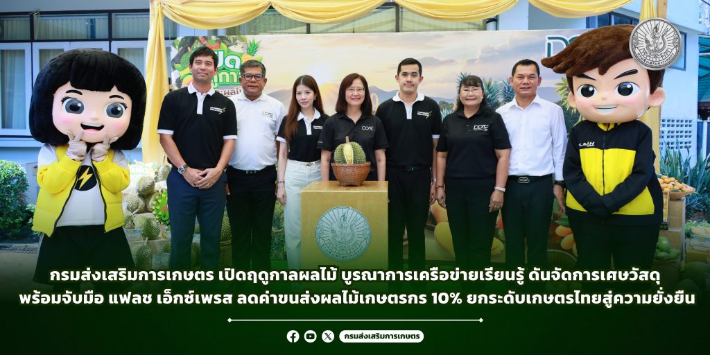 กรมส่งเสริมการเกษตร “เปิดฤดูกาลผลไม้” ผนึกกำลังเครือข่ายภาคีทุกภาคส่วน บูรณาการการทำงานผ่านแนวคิด “Learning Network” พร้อมจับมือ แฟลช เอ็กซ์เพรส ลดค่าขนส่งผลไม้เกษตรกร 10% มุ่งยกระดับการบริหารจัดการเศษวัสดุทางการเกษตรและระบบโลจิสติกส์ภาคเกษตรอย่างครบวงจร เพื่อเพิ่มประสิทธิภาพการผลิต ลดต้นทุน และสร้างมูลค่าเพิ่มให้กับผลผลิตผลไม้ไทย