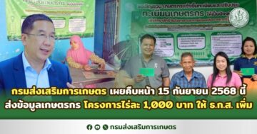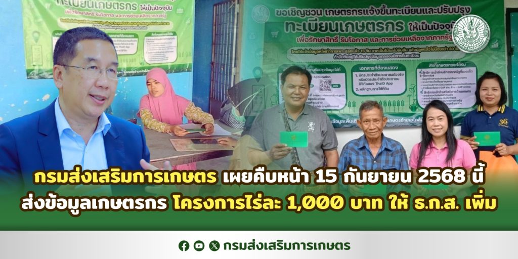 กรมส่งเสริมการเกษตร เผยคืบหน้า 15 กันยายน 2568 นี้ ส่งข้อมูลเกษตรกร โครงการไร่ละ 1,000 บาท ให้ ธ.ก.ส. เพิ่ม