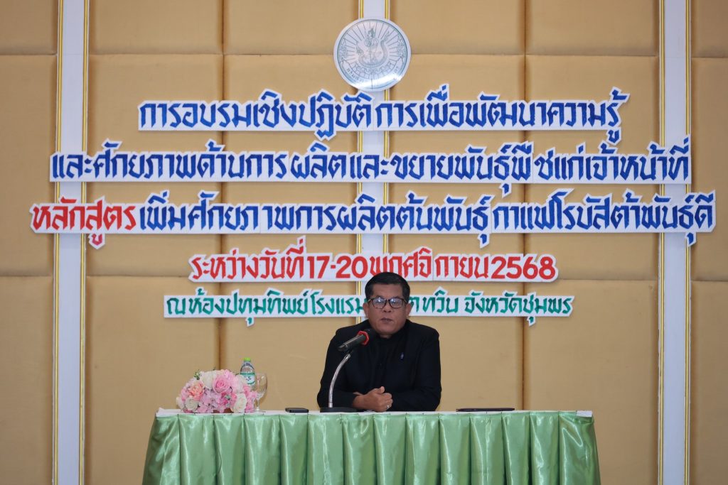 ทั้งนี้ เพื่อเป็นการพัฒนาความรู้และศักยภาพด้านการผลิตและขยายพันธุ์พืชแก่เจ้าหน้าที่ กรมส่งเสริมการเกษตร โดยกองขยายพันธุ์พืช จึงได้จัดการฝึกอบรมเชิงปฏิบัติการ หลักสูตร เพิ่มศักยภาพการผลิตต้นพันธุ์กาแฟ โรบัสต้าพันธุ์ดีแก่เจ้าหน้าที่ ณ โรงแรมมรกต ทวิน อำเภอเมืองชุมพร จังหวัดชุมพร โดยมุ่งเน้นให้เจ้าหน้าที่และผู้เกี่ยวข้องสามารถนำองค์ความรู้ และเทคโนโลยีที่เหมาะสมไปประยุกต์ใช้ในการจัดทำแปลงแม่พันธุ์ (Mother Stock) อย่างถูกต้อง ตั้งแต่ขั้นตอนการออกแบบและจัดทำแปลงพันธุ์ที่เหมาะสม การป้องกันและจัดการโรค/แมลง ตลอดจนเทคนิคการผลิตและขยายต้นพันธุ์ กาแฟพันธุ์ดีให้มีคุณภาพและได้มาตรฐาน ซึ่งจะช่วยยกระดับขีดความสามารถของบุคลากรและเสริมสร้างความเข้มแข็งของระบบการผลิตพืชพันธุ์ดีอย่างมีประสิทธิภาพยิ่งขึ้น กิจกรรมการจัดอบรมประกอบด้วย การบรรยาย การแบ่งกลุ่มระดมความคิดเห็น พร้อมทั้งการศึกษาดูงาน ณ ศูนย์วิจัยพืชสวนชุมพร กรมวิชาการเกษตร และสวนนิลเขียว จังหวัดชุมพร