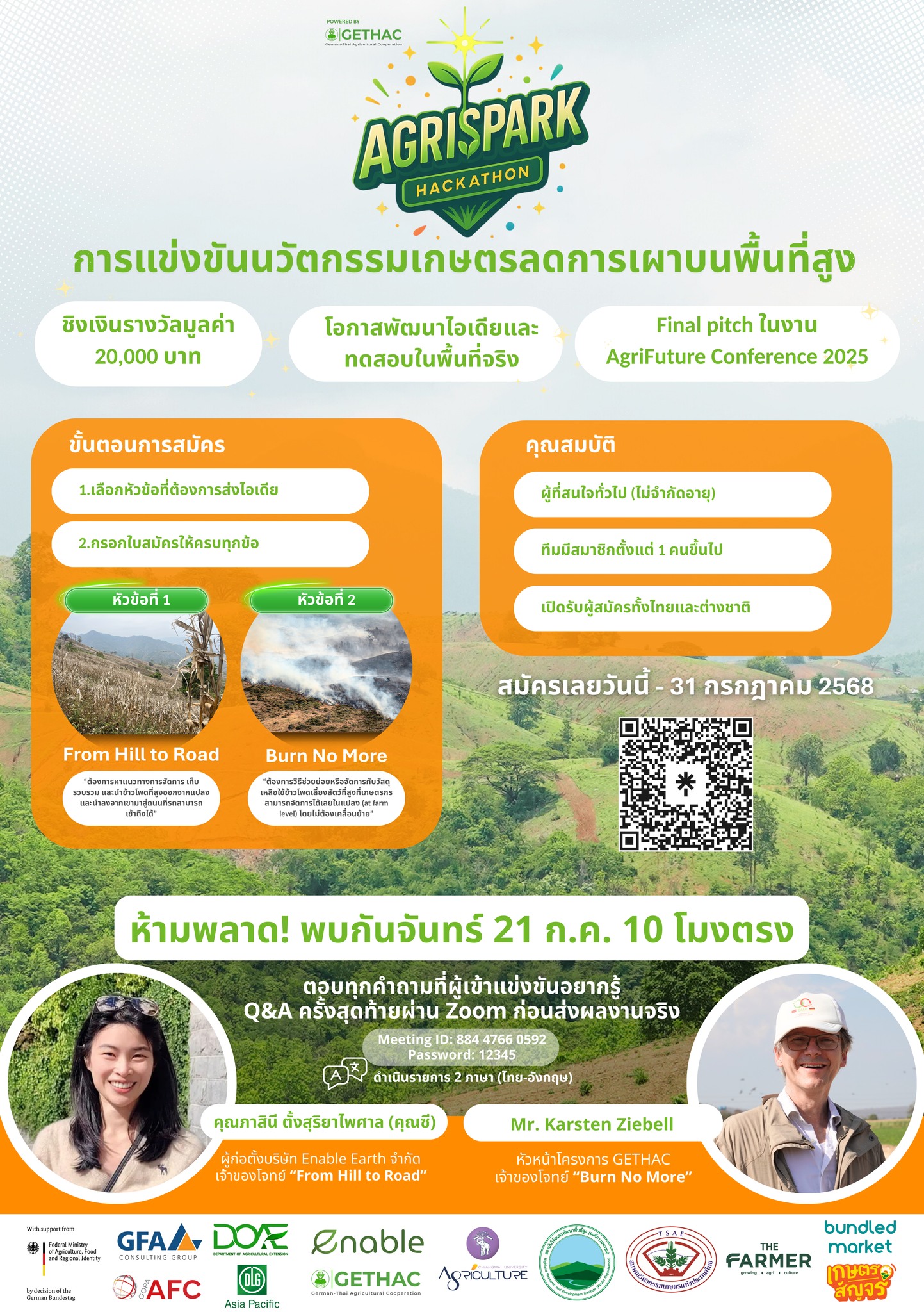 โครงการเยอรมัน-ไทยด้านการเกษตร (GETHAC/จีแทค) ร่วมกับกรมส่งเสริมการเกษตร (DoAE) ประกาศเปิดตัว AgriSpark 2025 ในธีม Hack the Hills! ที่มุ่งเน้นการหาแนวทางจัดการกับวัสดุเหลือใช้ข้าวโพดเลี้ยงสัตว์ที่สูงให้มีวิธีที่เป็นมิตรต่อสิ่งแวดล้อมมากขึ้น มีทางเลือกให้เกษตรกรเพิ่มมากขึ้นนอกจากการต้องเผา (open burning) การแข่งขันในครั้งนี้จึงมุ่งเน้นการหานวัตกรรมที่ใช้ได้จริง ต้นทุนจับต้องได้ และสามารถนำไปขยายผลได้ เพื่อแก้ปัญหาการจัดการวัสดุเหลือใช้โดยวิธีการเผาในพื้นที่ทำการเกษตรบนที่สูงของประเทศไทย