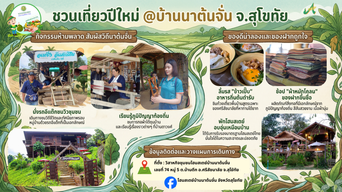 บ้านนาต้นจั่น เป็นหมู่บ้านเล็ก ๆ ที่โอบล้อมด้วยทุ่งนาและป่าไม้เขียวขจี เป็นหมู่บ้านที่คนภายนอก แทบไม่รู้จัก ชื่อนี้มาจากต้นไม้ใหญ่ที่เคยตั้งตระหง่านกลางทุ่งนา เป็นเหมือนสัญลักษณ์แห่งชีวิตและความ อุดมสมบูรณ์ของชุมชน เมื่อก่อนคนที่นี่ดำเนินชีวิตเรียบง่าย พึ่งพาผืนดิน ปลูกข้าว ปลูกผัก เลี้ยงสัตว์ตามวิถีดั้งเดิม ชาวบ้านรู้จักช่วยเหลือกันเหมือนครอบครัวเดียวกัน แต่เมื่อยุคสมัยเปลี่ยนไป คนรุ่นใหม่เริ่มย้ายออกไปทำงาน ในเมือง ทิ้งบ้านเกิดให้เงียบเหงาจนกระทั่งวันหนึ่ง ชาวบ้านกลุ่มเล็ก ๆ รวมตัวกันคิดว่า “ถ้าอยากให้ลูกหลานกลับมา ถ้าอยากให้หมู่บ้านมีชีวิตอีกครั้ง ต้องใช้สิ่งที่มีอยู่แล้ว ผืนดิน ธรรมชาติ และวิถีชีวิตมาสร้างคุณค่า” จึงก่อตั้งวิสาหกิจชุมชนกลุ่มโฮมสเตย์บ้านนาต้นจั่นเปิดบ้านของตัวเองให้กลายเป็นที่พักต้อนรับแขกจากทั่วสารทิศ โดยไม่ได้ขายเพียงแค่ “ที่นอน” แต่ขาย“เรื่องราวและความรู้สึกเหมือนได้กลับบ้าน” แขกที่มาที่นี่จะได้ตื่นเช้าพร้อมเสียงไก่ขัน สูดกลิ่นไอดินและหมอกบาง ๆ จากภูเขา ได้ลงนาเกี่ยวข้าวกับชาวบ้าน ได้ชิม “ข้าวเปิ๊บ” อาหารพื้นบ้านที่ทำกันตั้งแต่โบราณ และนั่งฟังคุณตาคุณยายเล่าเรื่องราวในอดีต ทุกคนที่มาพักมักพูดเหมือนกันว่า “บ้านนาต้นจั่นไม่ได้มีแค่สถานที่สวย ๆ แต่มีหัวใจของผู้คน” เพราะที่นี่ไม่ใช่เพียงจุดหมายปลายทางของ การเดินทาง แต่เป็น จุดเริ่มต้นของความทรงจำ ที่จะทำให้นักท่องเที่ยวอยากกลับมาอีกครั้ง และบอกต่อให้คนอื่นมาสัมผัสด้วยหัวใจ