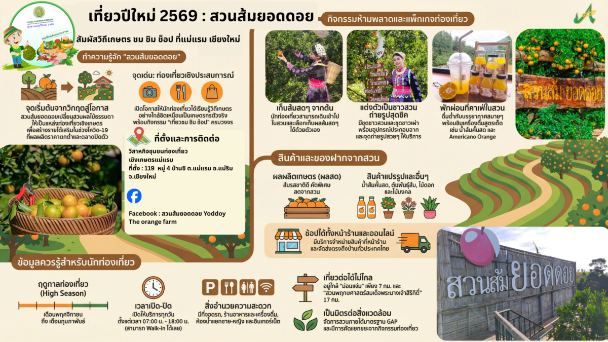 นักท่องเที่ยวหรือผู้มาเยือนสามารถเก็บผลส้มสดได้เองจากในสวน และมีจุดถ่ายรูปสวยๆ พร้อมทั้งอุปกรณ์, เครื่องแต่งกายแบบชาวสวนให้บริการ รวมถึงจุดพักผ่อนในคาเฟ่สวนส้ม