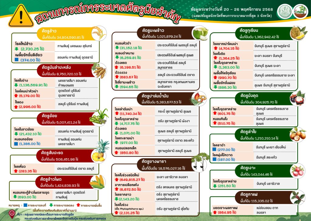 สถานการณ์การระบาดศัตรูพืชสำคัญ ระหว่างวันที่ 20 – 26 พฤศจิกายน 2568 ธันวาคม 1, 2568ธันวาคม 1, 2025 กองส่งเสริมการอารักขาพืชและจัดการดินปุ๋ย ข่าวแจ้งเตือน จัดทำโดย : กลุ่มพยากรณ์และเตือนการระบาดศัตรูพืช กองส่งเสริมการอารักขาพืชและจัดการดินปุ๋ย Favorite กองส่งเสริมการอารักขาพืชและจัดการดินปุ๋ย