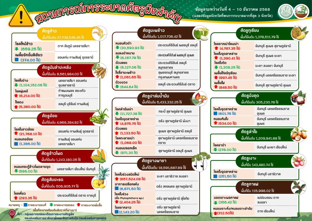 สถานการณ์การระบาดศัตรูพืชสำคัญ ระหว่างวันที่ 4 – 10 ธันวาคม 2568 ธันวาคม 16, 2568ธันวาคม 16, 2025 กองส่งเสริมการอารักขาพืชและจัดการดินปุ๋ย ข่าวแจ้งเตือน จัดทำโดย : กลุ่มพยากรณ์และเตือนการระบาดศัตรูพืช กองส่งเสริมการอารักขาพืชและจัดการดินปุ๋ย Favorite กองส่งเสริมการอารักขาพืชและจัดการดินปุ๋ย