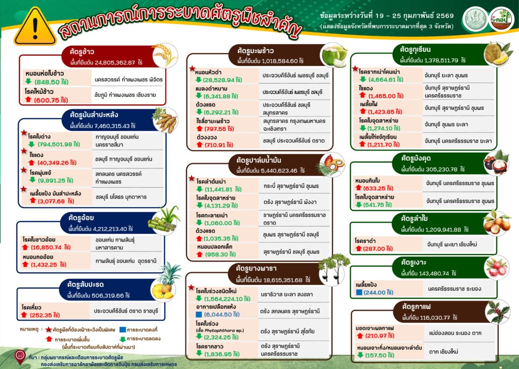 สถานการณ์การระบาดศัตรูพืชสำคัญ ระหว่างวันที่ 19 – 25 กุมภาพันธ์2569 มีนาคม 6, 2569มีนาคม 6, 2026 กองส่งเสริมการอารักขาพืชและจัดการดินปุ๋ย ข่าวแจ้งเตือน จัดทำโดย : กลุ่มพยากรณ์และเตือนการระบาดศัตรูพืช กองส่งเสริมการอารักขาพืชและจัดการดินปุ๋ย Favorite กองส่งเสริมการอารักขาพืชและจัดการดินปุ๋ย