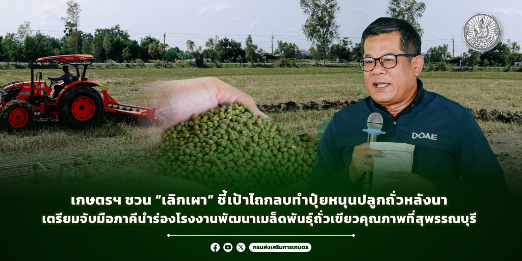 นายรพีทัศน์ อุ่นจิตตพันธ์ รองอธิบดีกรมส่งเสริมการเกษตร เปิดเผยว่า กรมส่งเสริมการเกษตร สนองนโยบายขับเคลื่อนโครงการบูรณาการผลิตถั่วเหลืองและถั่วเขียวพันธุ์ดีเพื่อส่งเสริมการปลูกพืชหลังนาของกระทรวงเกษตรและสหกรณ์ เพื่อส่งเสริมการปลูกพืชฤดูแล้งทดแทนการปลูกข้าวในพื้นที่นาปรังหรือพื้นที่นอกเขตชลประทาน และส่งเสริมให้เกษตรกรมีทักษะในการผลิตและจำหน่ายเมล็ดพันธุ์ โดยจังหวัดสุพรรณบุรีเป็นพื้นที่สำคัญในการปลูกถั่วเขียว จึงวางแนวทางด้วยกลไก “ตลาดนำการผลิต” ดำเนินงานร่วมกับหน่วยงานภาคีและภาคเอกชน ในการสร้างโรงงานที่ใช้เทคโนโลยีพัฒนาคุณภาพเมล็ดพันธุ์ให้ดียิ่งขึ้น เหมาะต่อการเป็นเมล็ดพันธุ์ดีสำหรับเพาะปลูก