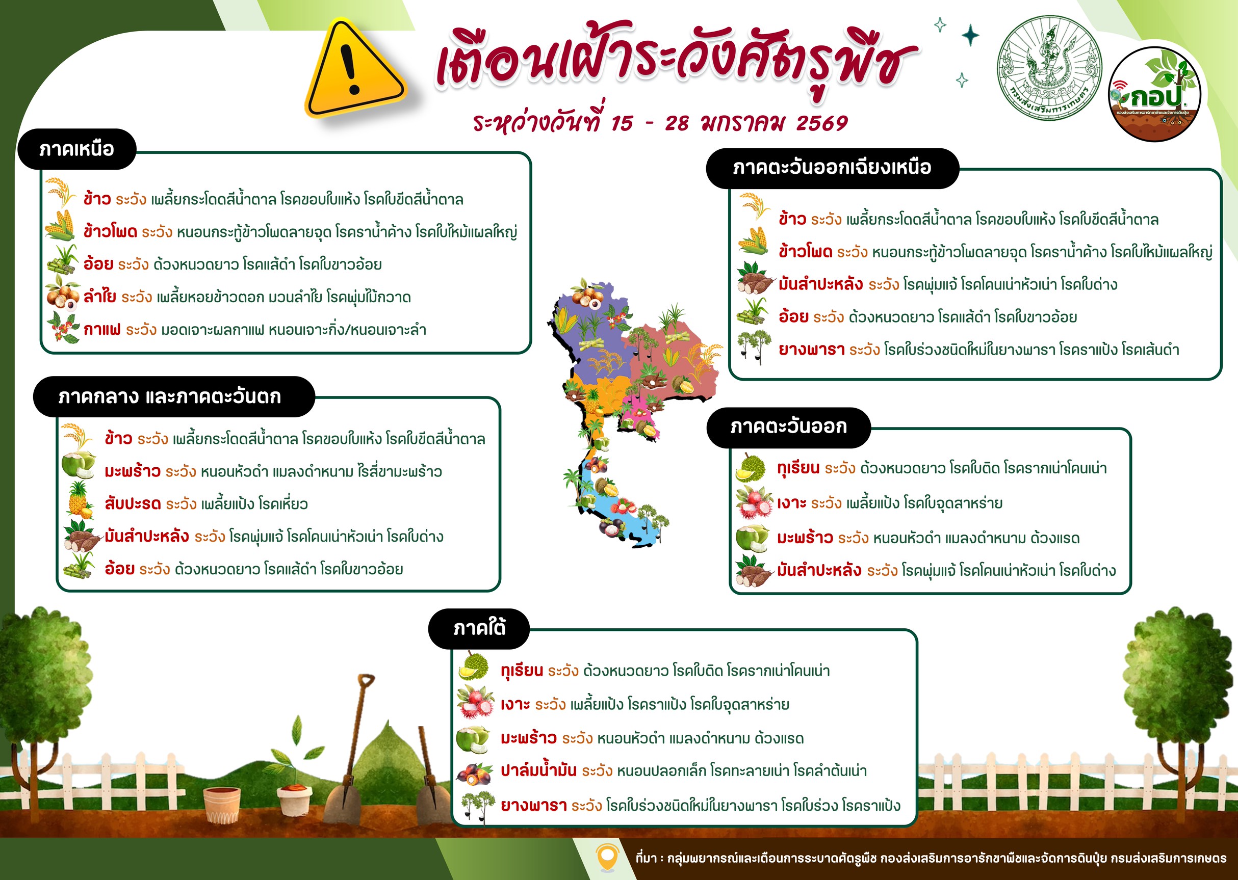 เตือนเฝ้าระวังศัตรูพืชระหว่างวันที่ 15 – 28 มกราคม 2569 มกราคม 20, 2569มกราคม 20, 2026 กองส่งเสริมการอารักขาพืชและจัดการดินปุ๋ย Uncategorized จัดทำโดย : กลุ่มพยากรณ์และเตือนการระบาดศัตรูพืช กองส่งเสริมการอารักขาพืชและจัดการดินปุ๋ย Favorite กองส่งเสริมการอารักขาพืชและจัดการดินปุ๋ย