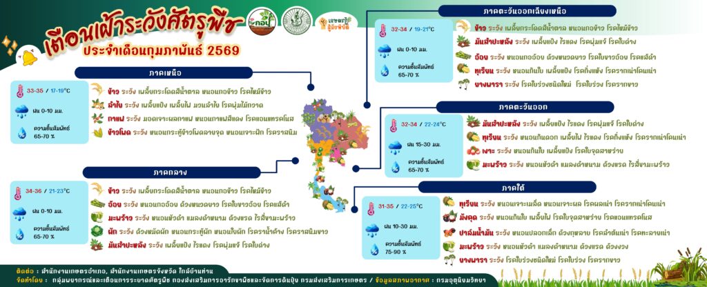 เตือนเฝ้าระวังศัตรูพืช ประจำเดือนกุมภาพันธ์ 2569 กุมภาพันธ์ 2, 2569กุมภาพันธ์ 2, 2026 กองส่งเสริมการอารักขาพืชและจัดการดินปุ๋ย ข่าวแจ้งเตือน จัดทำโดย : กลุ่มพยากรณ์และเตือนการระบาดศัตรูพืช กองส่งเสริมการอารักขาพืชและจัดการดินปุ๋ย Favorite กองส่งเสริมการอารักขาพืชและจัดการดินปุ๋ย