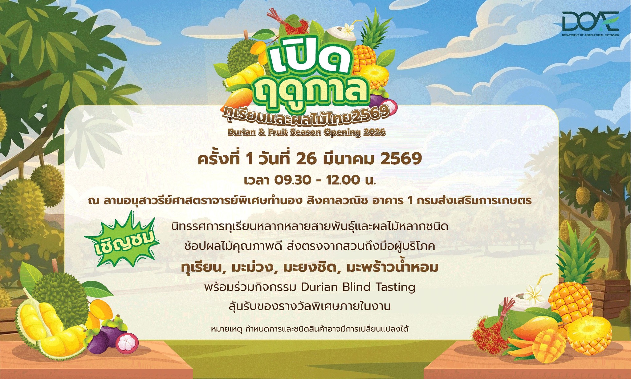 เปิดฤดูกาลทุเรียนและผลไม้ไทย 2569 มีนาคม 25, 2569มีนาคม 25, 2026 สำนักพัฒนาการถ่ายทอดเทคโนโลยี ข่าวกิจกรรม/ประชาสัมพันธ์ วันที่ 26 มีนาคม 2569 เวลา 09.30 เป็นต้นไป เตรียมพบกับกิจกรรม “เปิดฤดูกาลทุเรียนและผลไม้ไทย 2569” พบกับทุเรียนหลากหลายสายพันธุ์และผลไม้คุณภาพดีส่งตรงจากสวน ณ ลานอนุสาวรีย์ศาสตราจารย์พิเศษทำนอง สิงคาลวณิช อาคาร 1 กรมส่งเสริมการเกษตร Favorite สำนักพัฒนาการถ่ายทอดเทคโนโลยี