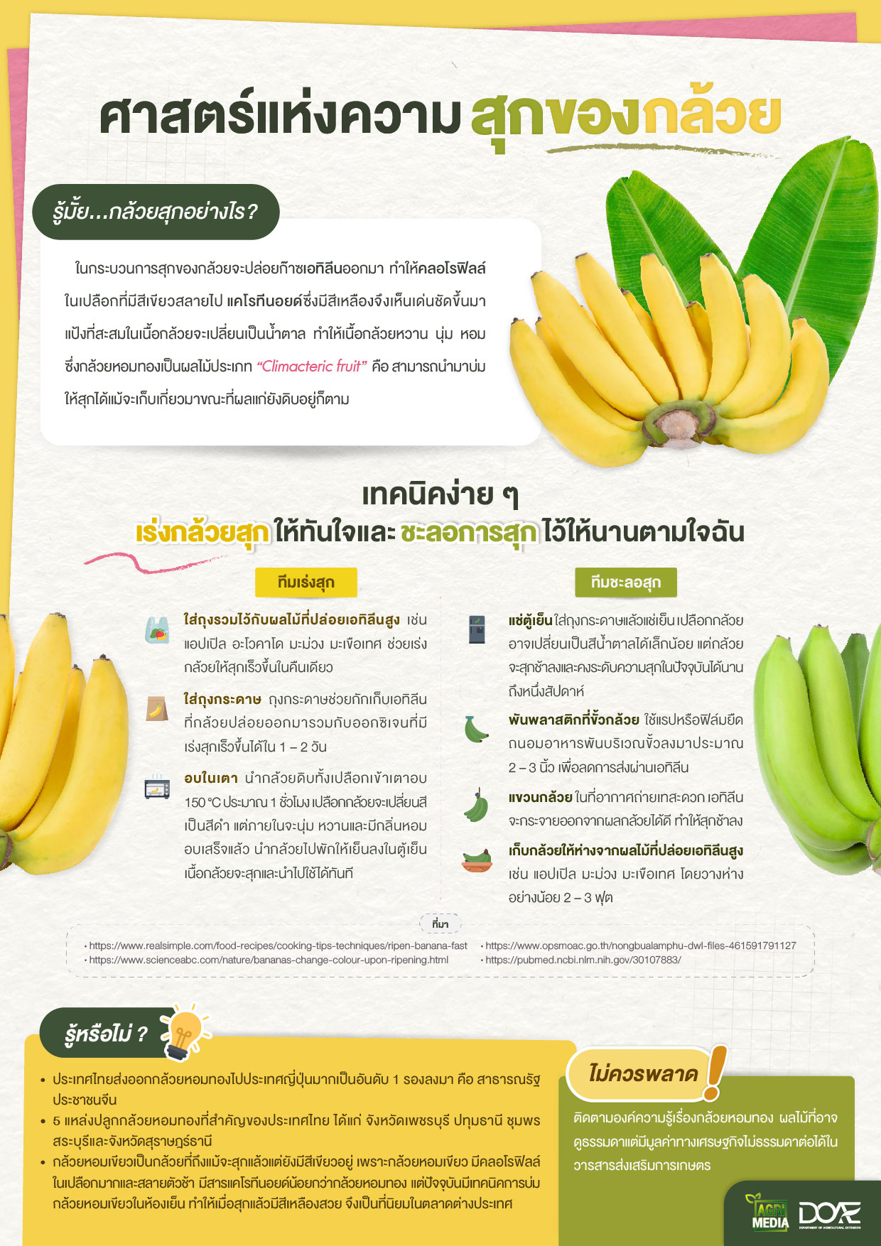 | บทนำ/รายละเอียดโดยย่อ | ในกระบวนการสุกของกล้วยจะปล่อยก๊าซเอทิลีนออกมา ทำให้คลอโรฟิลล์ในเปลือกที่มีสีเขียวสลายไป แคโรทินอยด์ซึ่งมีสีเหลืองจึงเห็นเด่นชัดขึ้นมา แป้งที่สะสมในเนื้อกล้วยจะเปลี่ยนเป็นสีน้ำตาล ทำให้เนื้อกล้วยหวาน นุ่ม หอม ซึ่งกล้วยหอมทองเป็นผลไม้ประเภท "Climacteric fruit" คือ สามารถนำมาบ่มให้สุกได้แม้จะเก็บเกี่ยวมาขณะที่ผลแก่ยังคงดิบอยู่ |