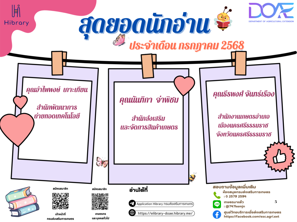 ขอเชิญสมาชิก Hibrary กรมส่งเสริมการเกษตร ร่วมโหวต e-Book ประจำเดือนกรกฎาคม 2568 ระหว่างวันที่ 22-29 กรกฎาคม 2568