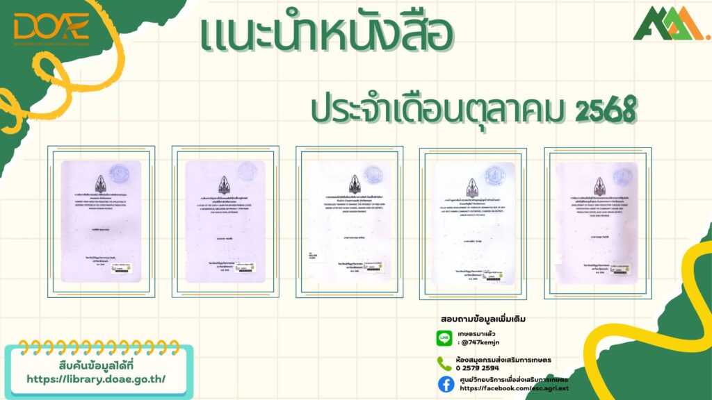 ห้องสมุดกรมส่งเสริมการเกษตร โทร. 0 2579 2594 หรือ Line เกษตรมาแล้ว ID LINE @747kemjn